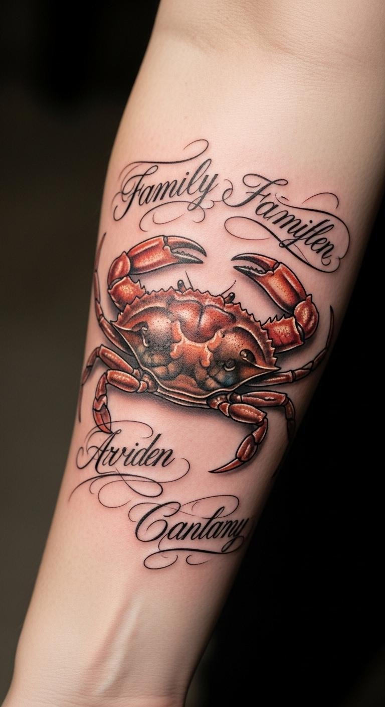 The names flowing around the crab create a personal narrative, reinforcing the deep emotional connections shared with each family member.