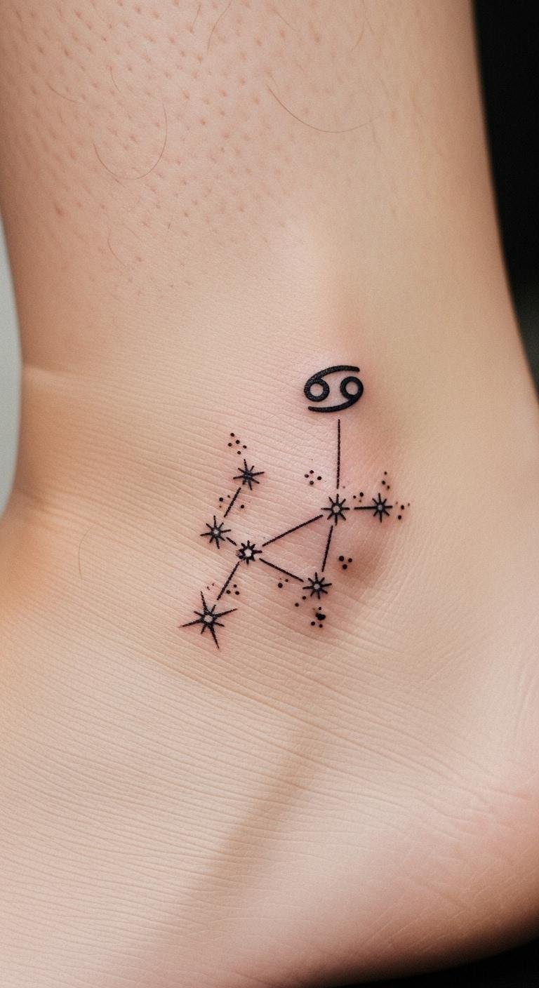 This small ankle tattoo of the Cancer constellation embodies a deep connection to astrological identity, celebrating emotional intuition and nurturing qualities.