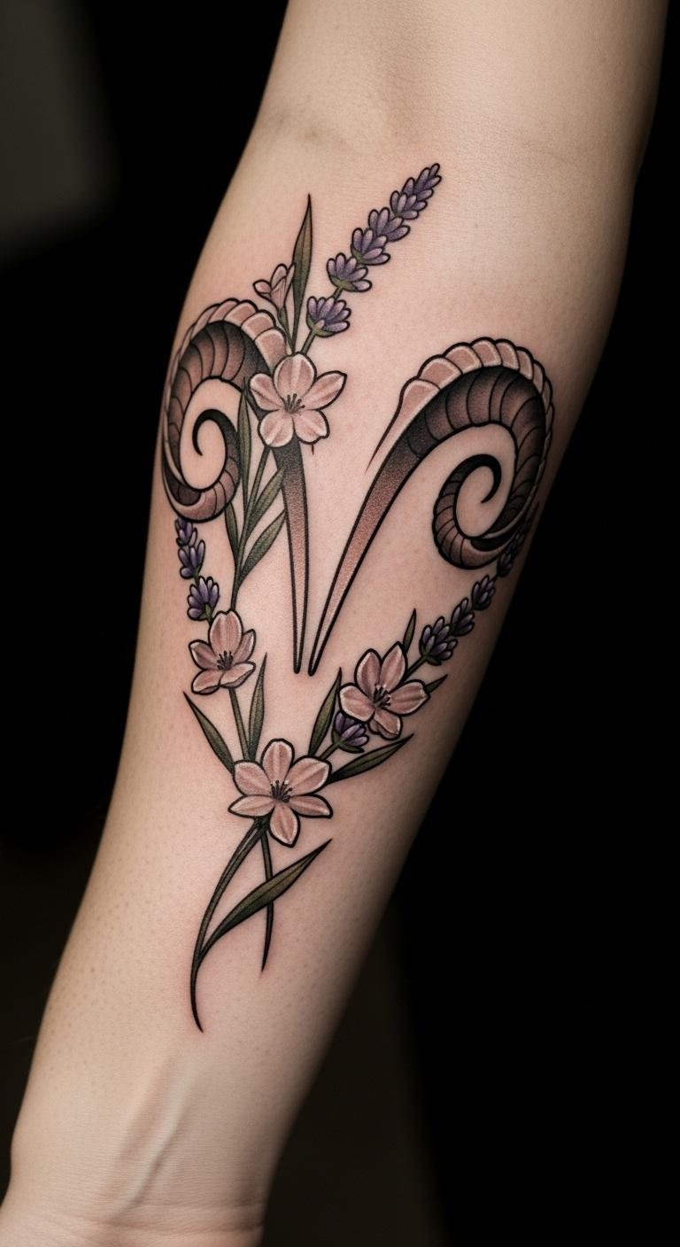 This tattoo beautifully merges the Aries symbol with lavender, which is known for its calming and nurturing properties.
