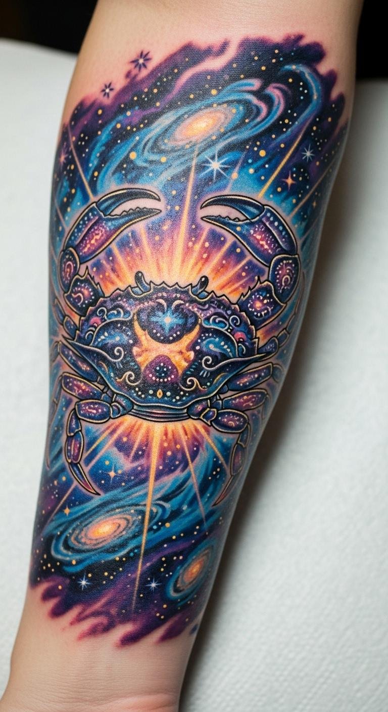 The cosmic explosion with a crab design symbolizes the emotional depth and intuition of Cancer, beautifully rendered on the forearm for visibility and personal expression.