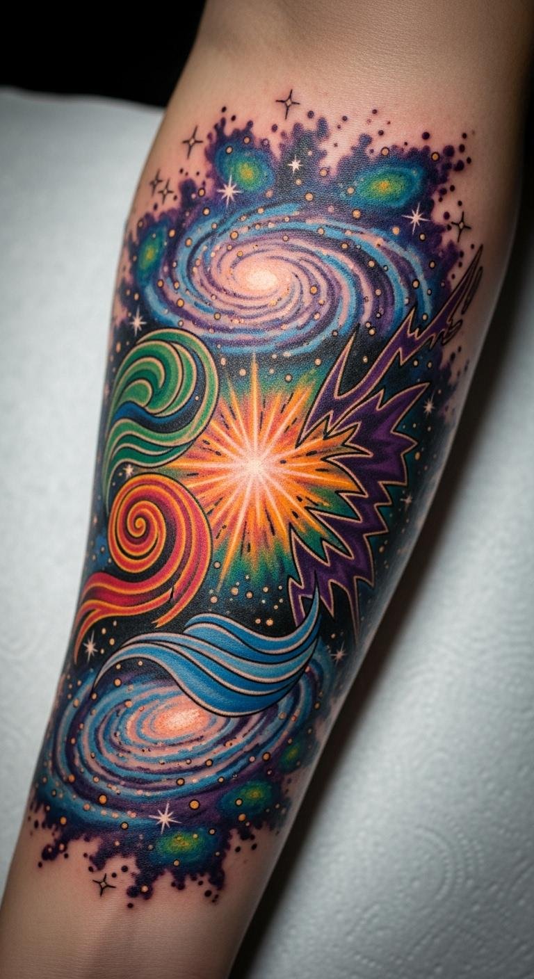 Placed on the forearm, this tattoo serves as a constant reminder of one’s connection to the cosmos, blending artistry with personal significance in a way that’s both visually striking and deeply meaningful.