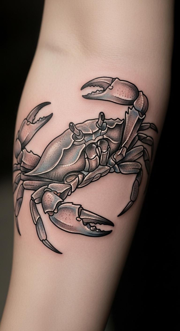 This crab portrait tattoo serves as a profound symbol of the Cancerian spirit, embodying nurturing qualities and emotional depth.