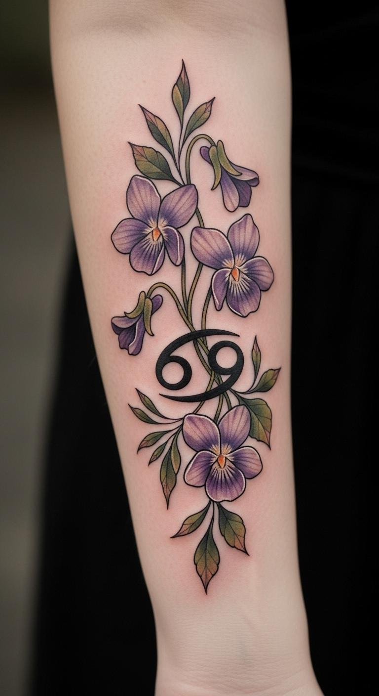 In this tattoo design, the incorporation of violets alongside the Cancer zodiac symbol embodies love, loyalty, and protection, reflecting the nurturing essence of Cancer.