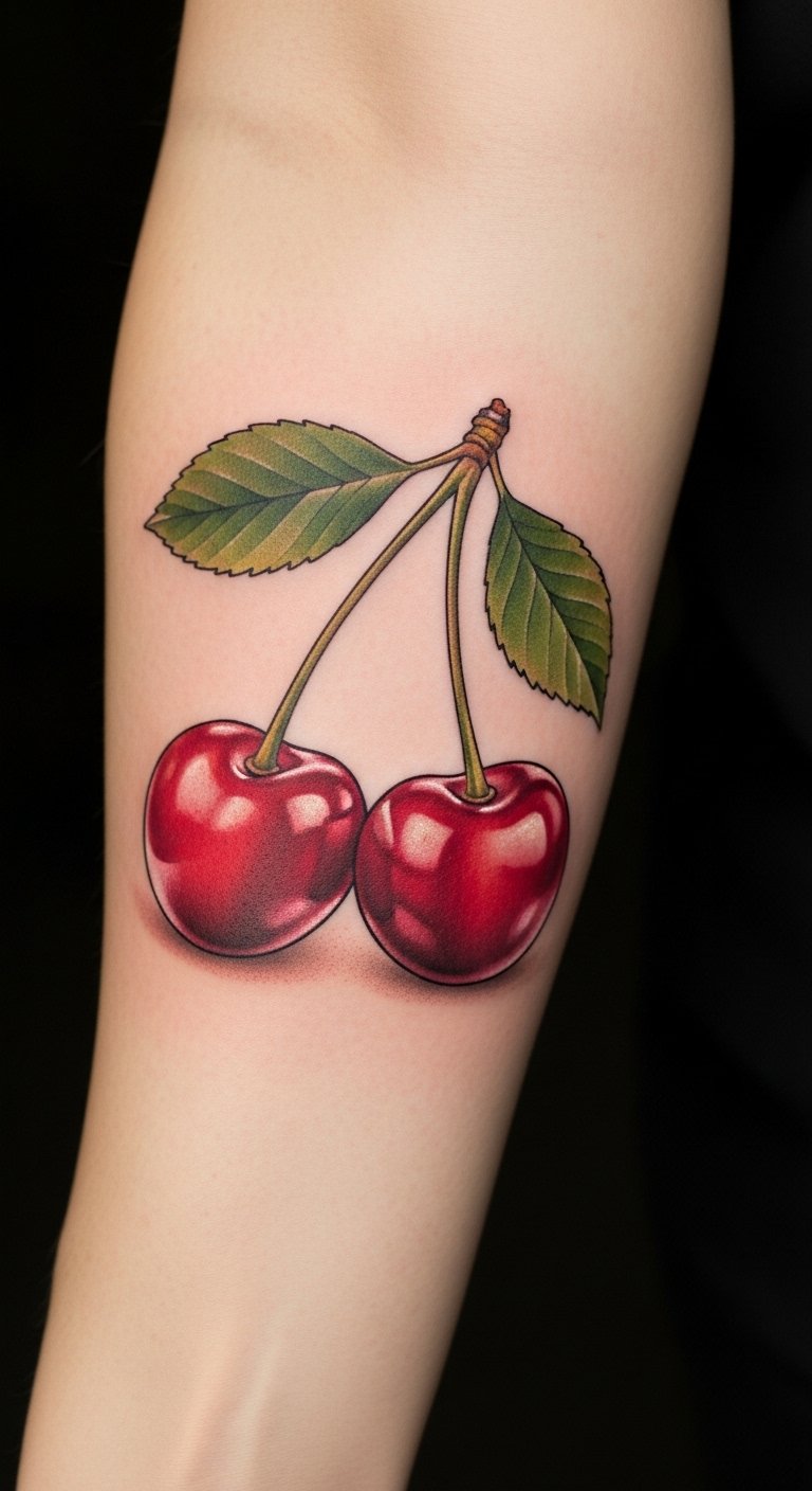 This cherry tattoo on the forearm symbolizes the beauty and sweetness of life, reminding the wearer to appreciate fleeting moments.