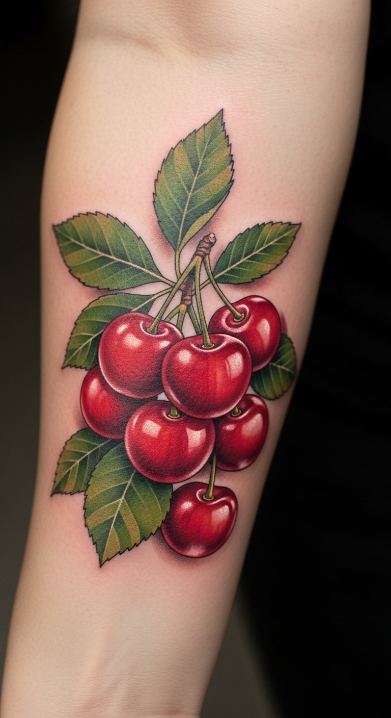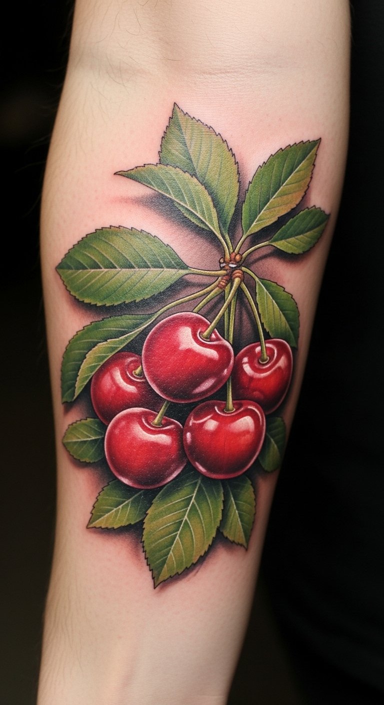 The tattoo embodies the essence of vitality and renewal, with the cherries symbolizing nourishment and resilience.
