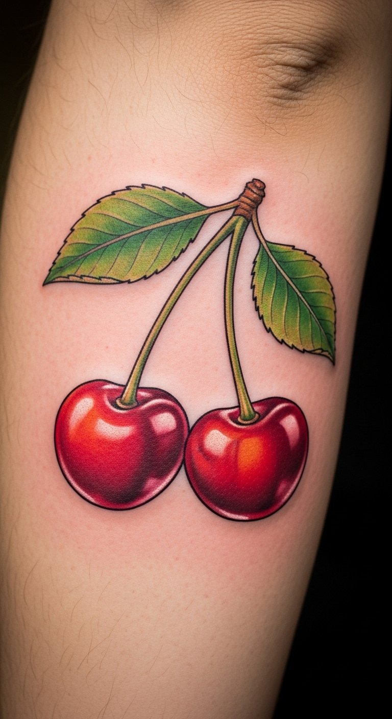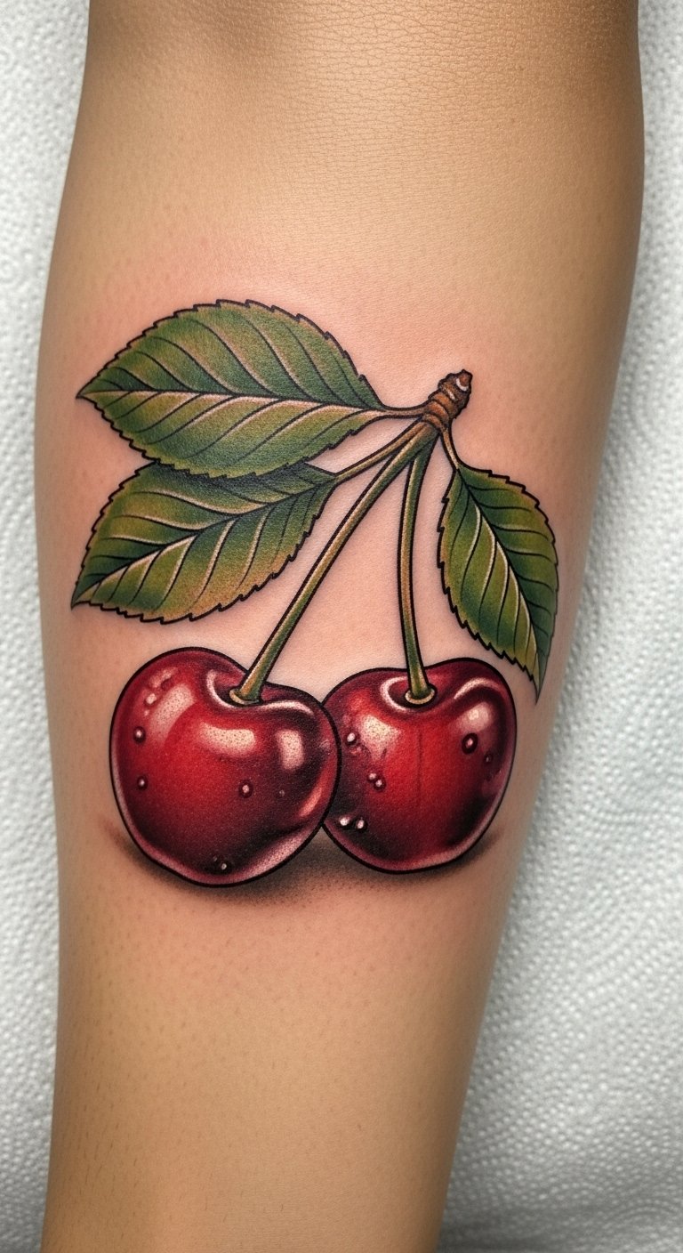 The cherry tattoo symbolizes personal growth, resilience, and the sweetness of life’s journey, making it a perfect choice for marking significant milestones.