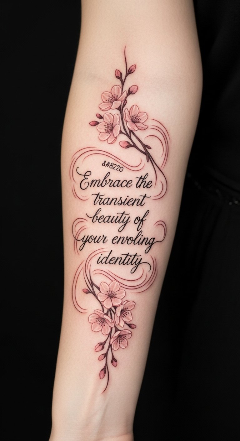 Positioned on the forearm, it remains visible as a constant reminder of resilience and evolution. The cherry blossoms represent fleeting moments and the importance of embracing each stage of life, while the flowing script encapsulates the essence of personal transformation.