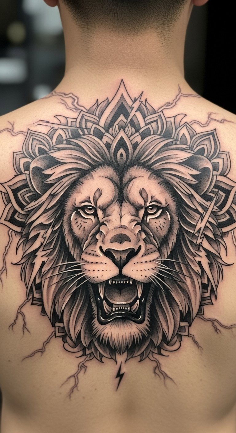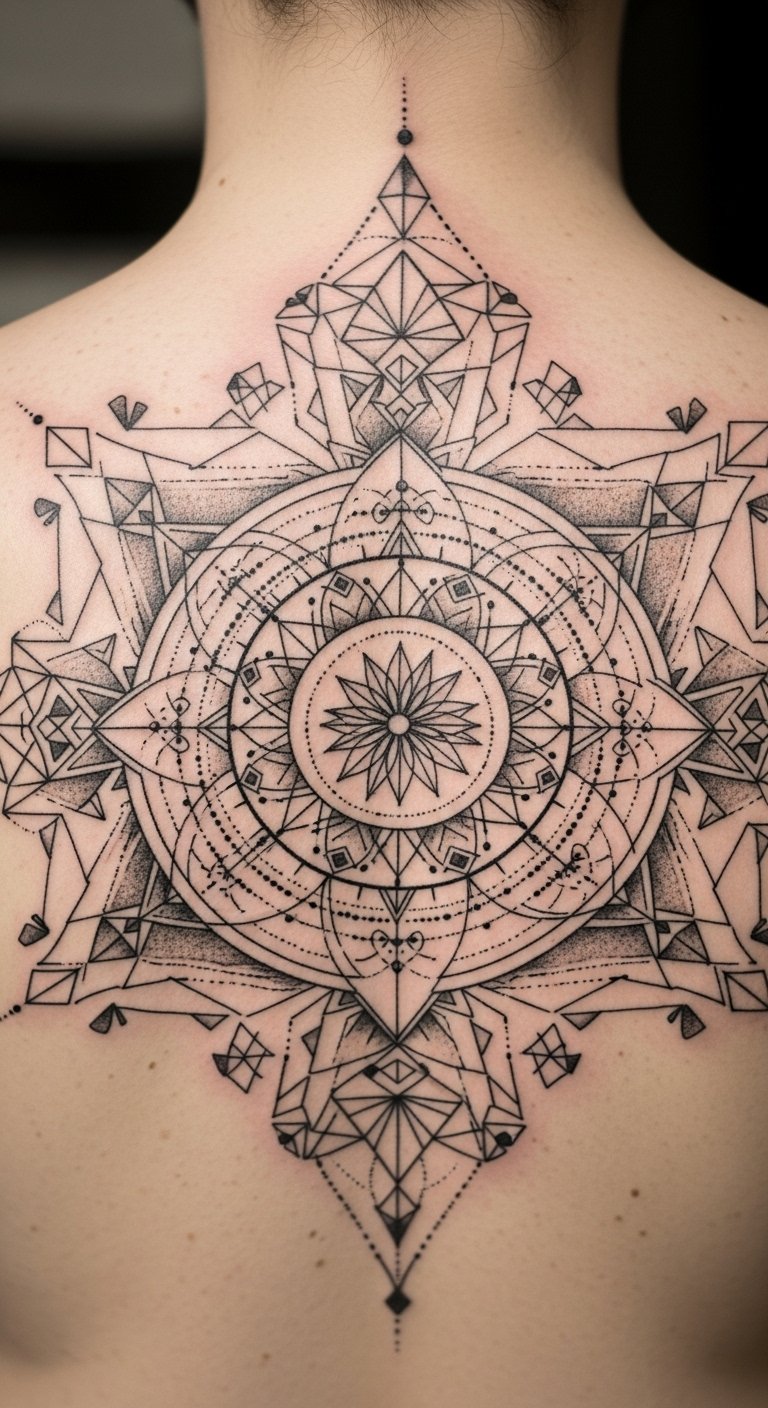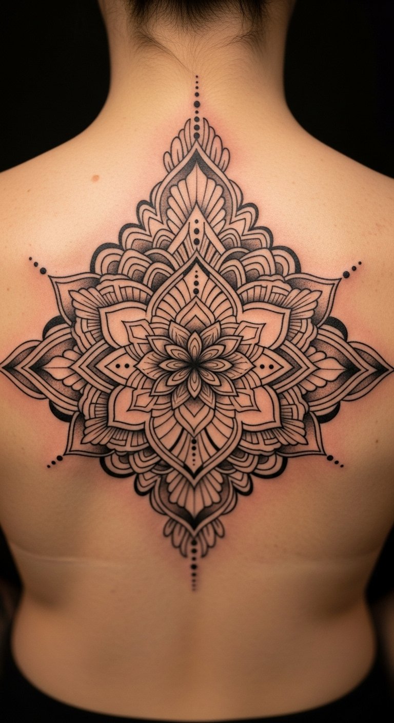 The spiritual mandala on the upper back symbolizes a journey towards inner peace and balance, serving as a reminder of one’s strength and personal growth.