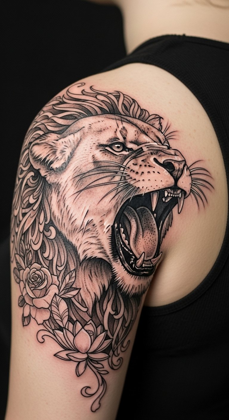 The lioness on the shoulder blade embodies strength and resilience, symbolizing the fierce protective instincts and grace of a warrior.