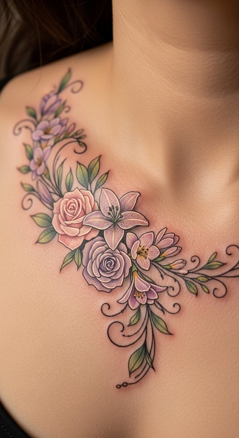 The placement along the collarbone symbolizes strength and vulnerability, as it’s a visible area that invites both admiration and introspection.