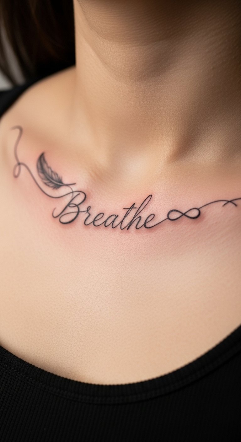 The collarbone tattoo symbolizes freedom and empowerment, with the feather representing lightness and the infinity sign embodying eternal strength.
