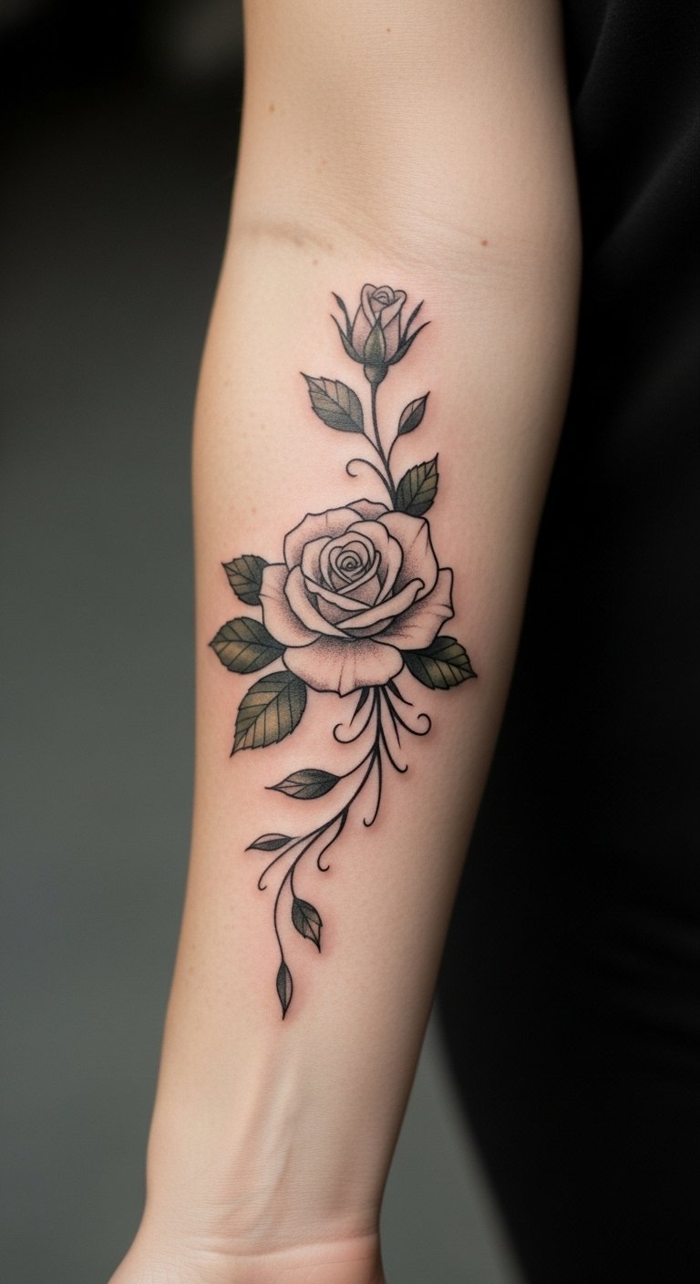 This tattoo design embodies the essence of love and growth, with the rose symbolizing passion and the vines representing the intertwined paths of relationships.