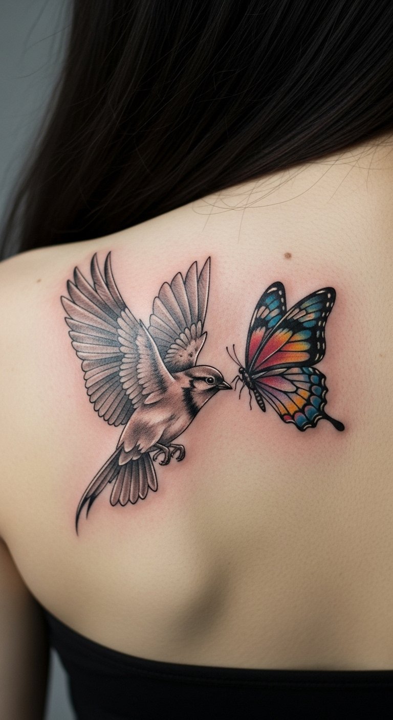The tattoo’s placement on the upper back symbolizes strength and freedom, as the bird represents the ability to rise above challenges, while the butterfly signifies personal transformation and resilience.