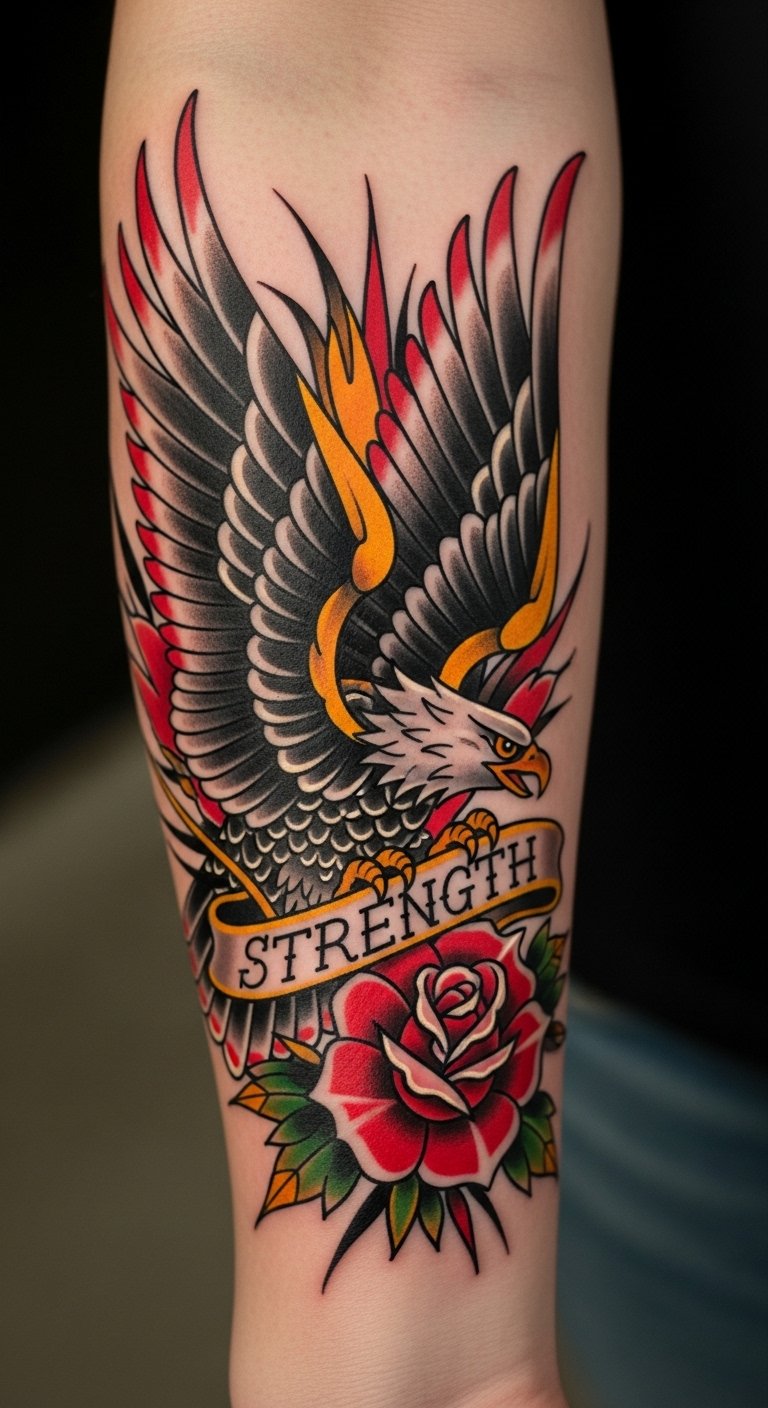This tattoo symbolizes freedom and resilience through the eagle, a powerful creature representing strength and courage.