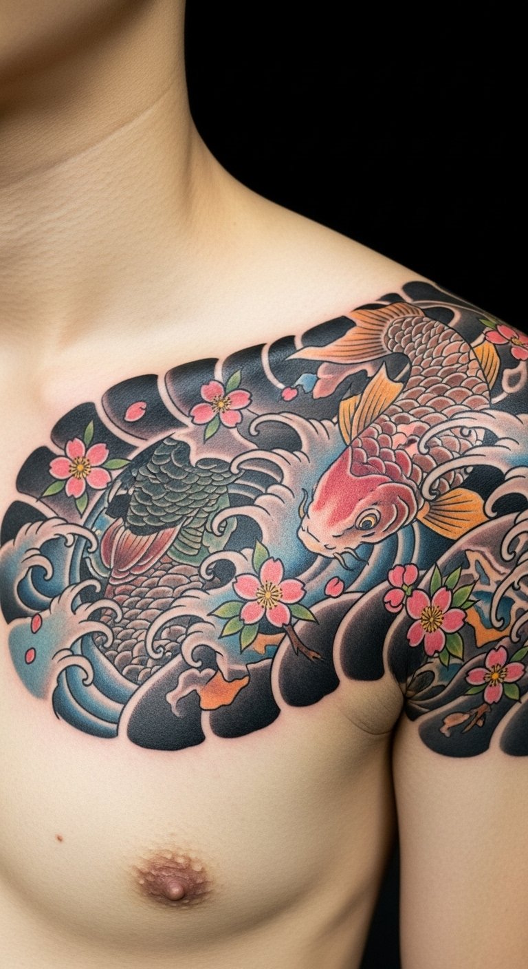The tattoo symbolizes female empowerment, with cherry blossoms representing beauty and the transient nature of life, while koi fish embody perseverance and strength.