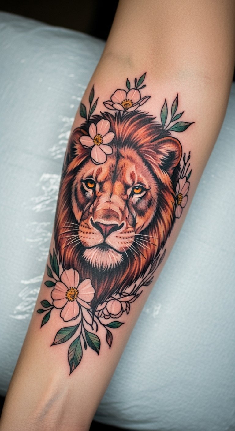 This tattoo embodies the powerful essence of femininity, symbolizing strength and resilience through the fierce lioness, while the delicate florals represent grace and individuality.