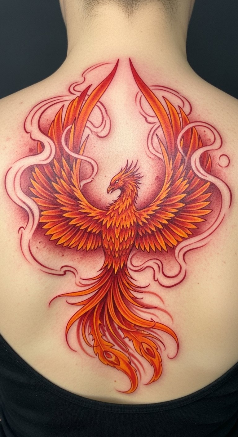 Positioned on the upper back, it serves as a powerful reminder of personal growth and transformation, visible yet intimate. The colors evoke warmth and passion, reflecting the strength within, while the intricate details convey the beauty that emerges from struggles.