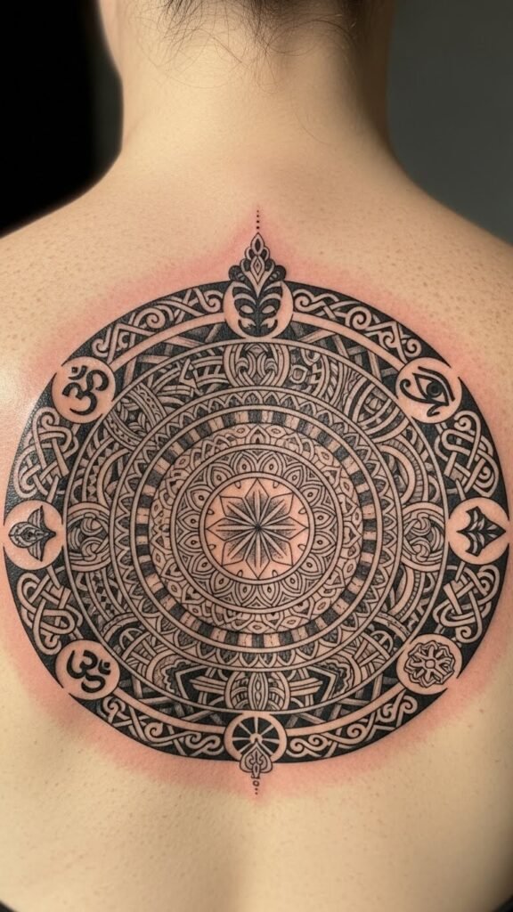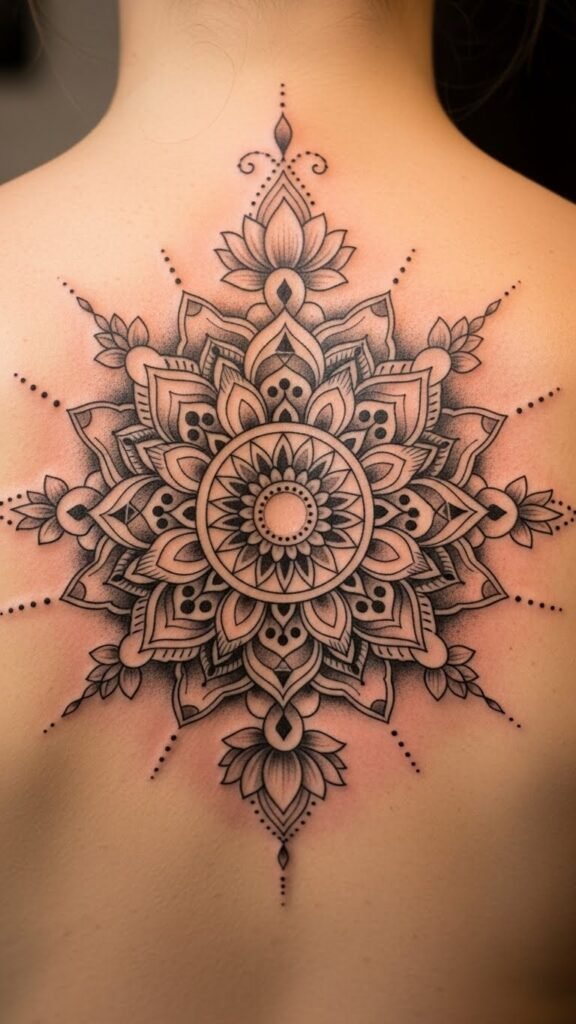 This mandala tattoo on the upper back serves as a powerful symbol of the universe and balance, reflecting the wearer’s journey towards inner peace and spirituality.