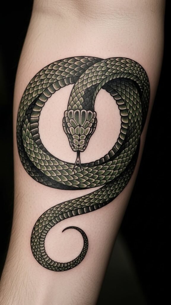 This Ouroboros tattoo embodies the eternal cycle of life, death, and rebirth, beautifully inked on the forearm for visibility.