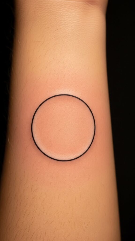 This minimalist circle tattoo embodies a timeless symbol of unity and balance, offering a personal touch that speaks to the wearer’s free spirit.