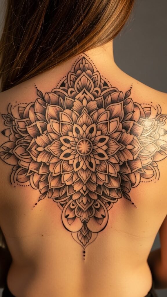 This upper back placement allows the floral mandala tattoo to be a striking yet personal statement, symbolizing balance and the interconnectedness of life.