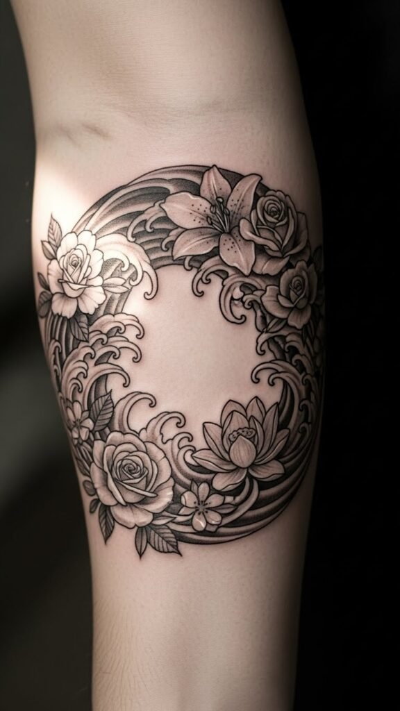 This nature-inspired circular tattoo beautifully symbolizes the interconnectedness of life and the cycles of growth.