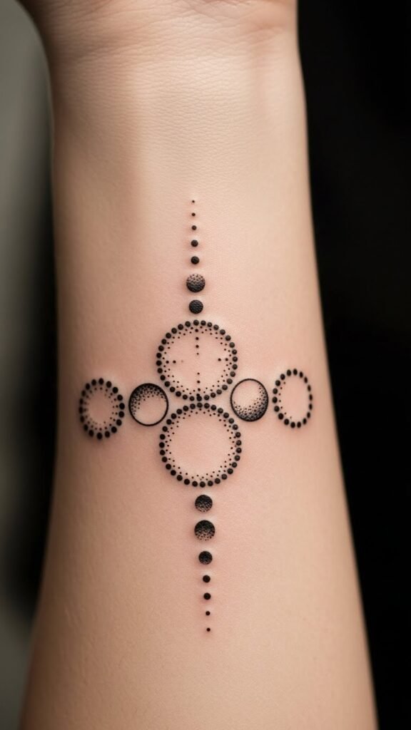 The placement on the forearm makes it easily visible yet intimate, inviting curiosity and conversation. The varying sizes and intricate dotwork add depth and dimension, evoking emotions of unity and continuity in life’s journey.
