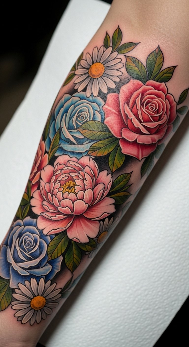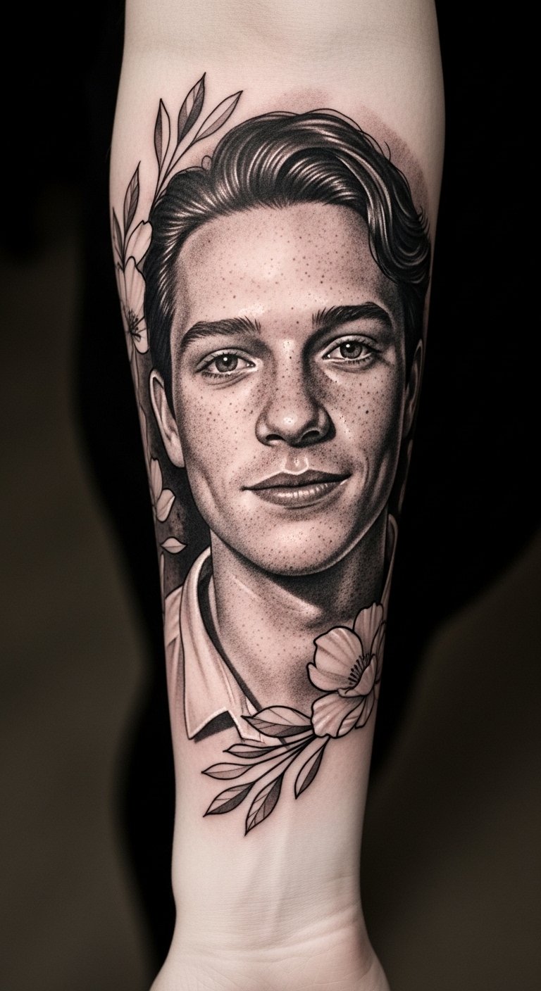The forearm placement allows for frequent reflection and connection, making it an intimate reminder of the bonds that shape our lives. The floral elements symbolize growth and beauty, enhancing the emotional resonance of the portrait.