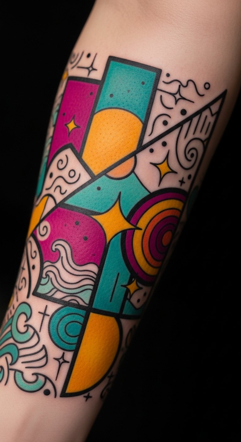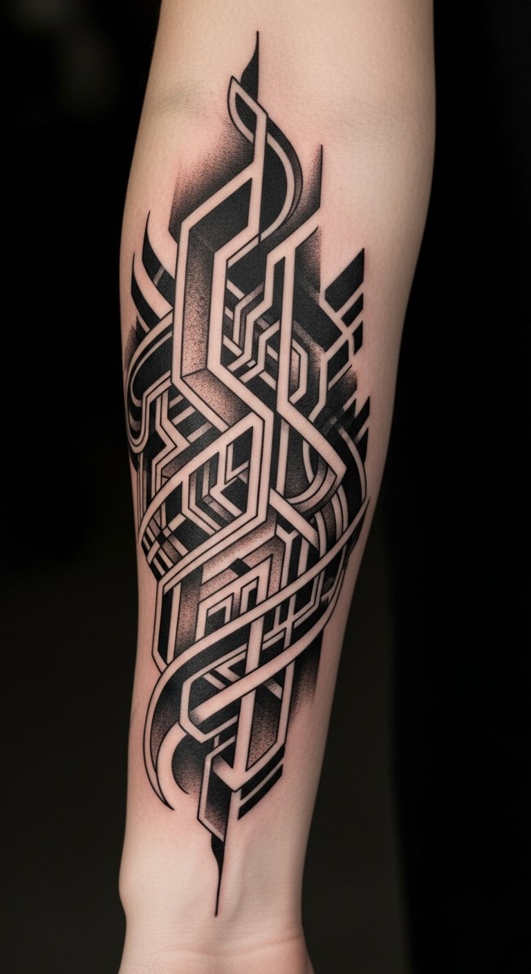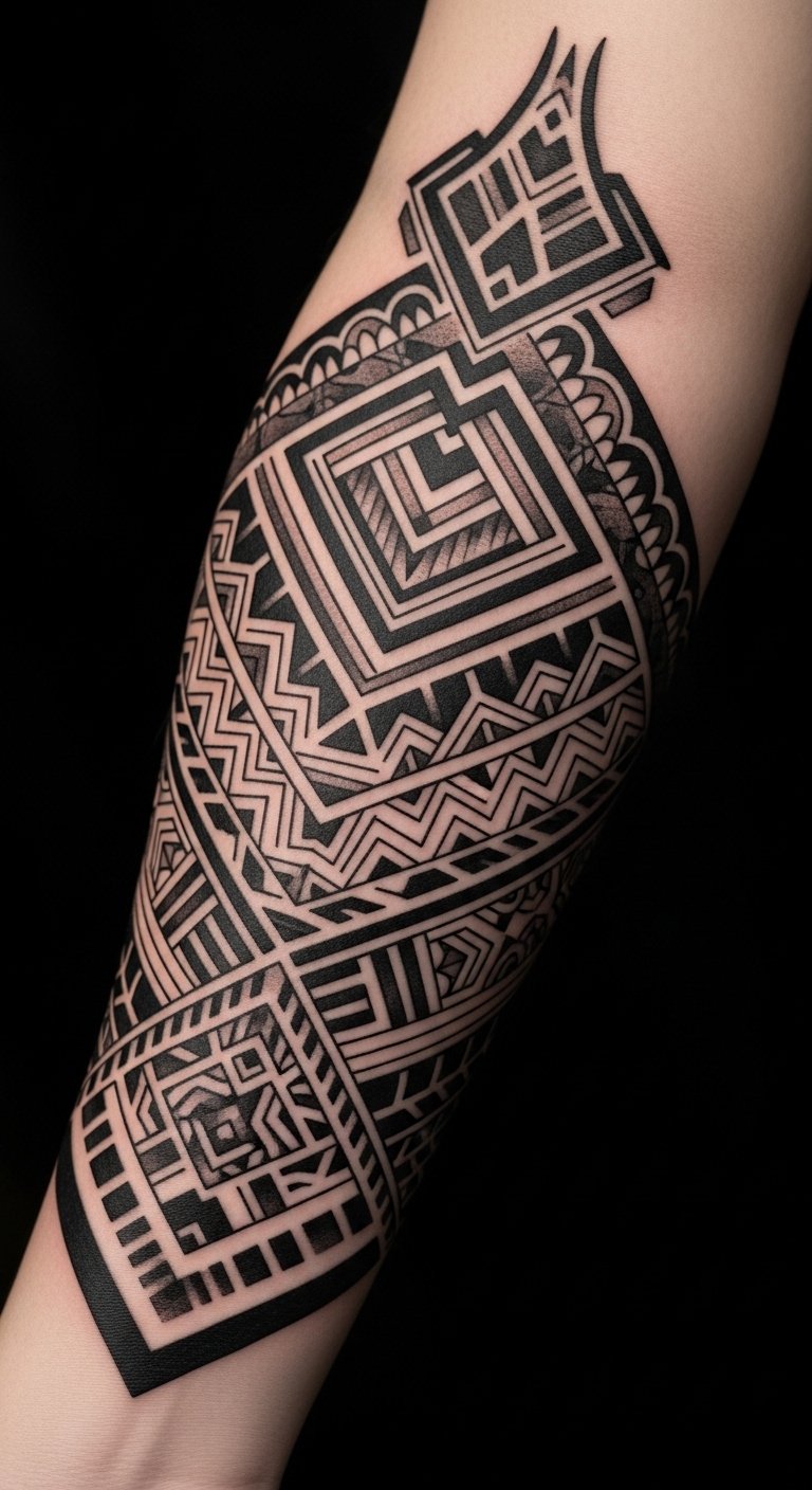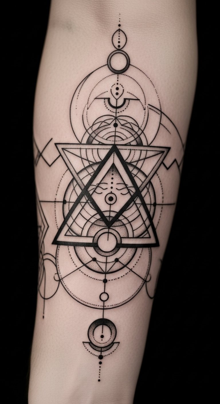 Positioned on the forearm, it allows for easy visibility, inviting conversations and self-expression. The geometric elements represent stability and balance, while the boldness of the black ink signifies strength and the ability to overcome past regrets, effectively redefining the wearer’s narrative through art.