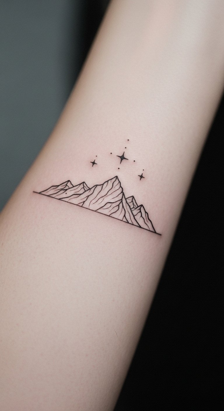 This tattoo symbolizes resilience and the journey of life, with the mountains representing challenges and the stars signifying hope and aspirations.