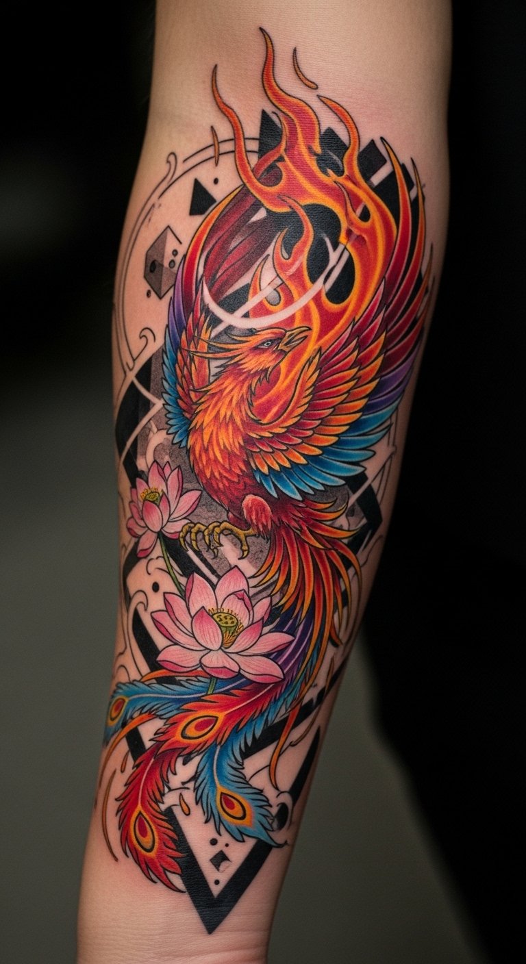 This tattoo design symbolizes rebirth and renewal, with the phoenix representing transformation and overcoming past regrets.