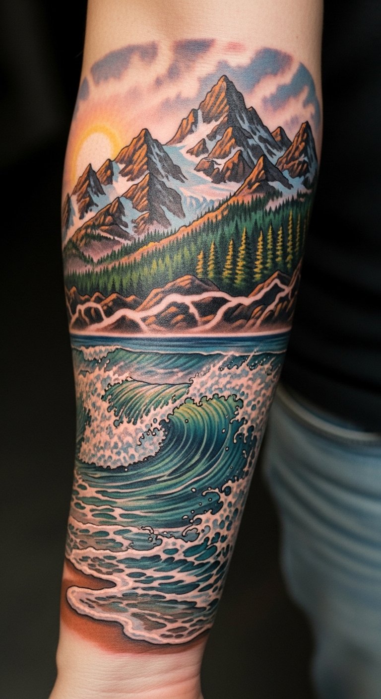 The combination of mountains and ocean waves represents a journey through life’s challenges and the importance of finding balance amidst chaos.