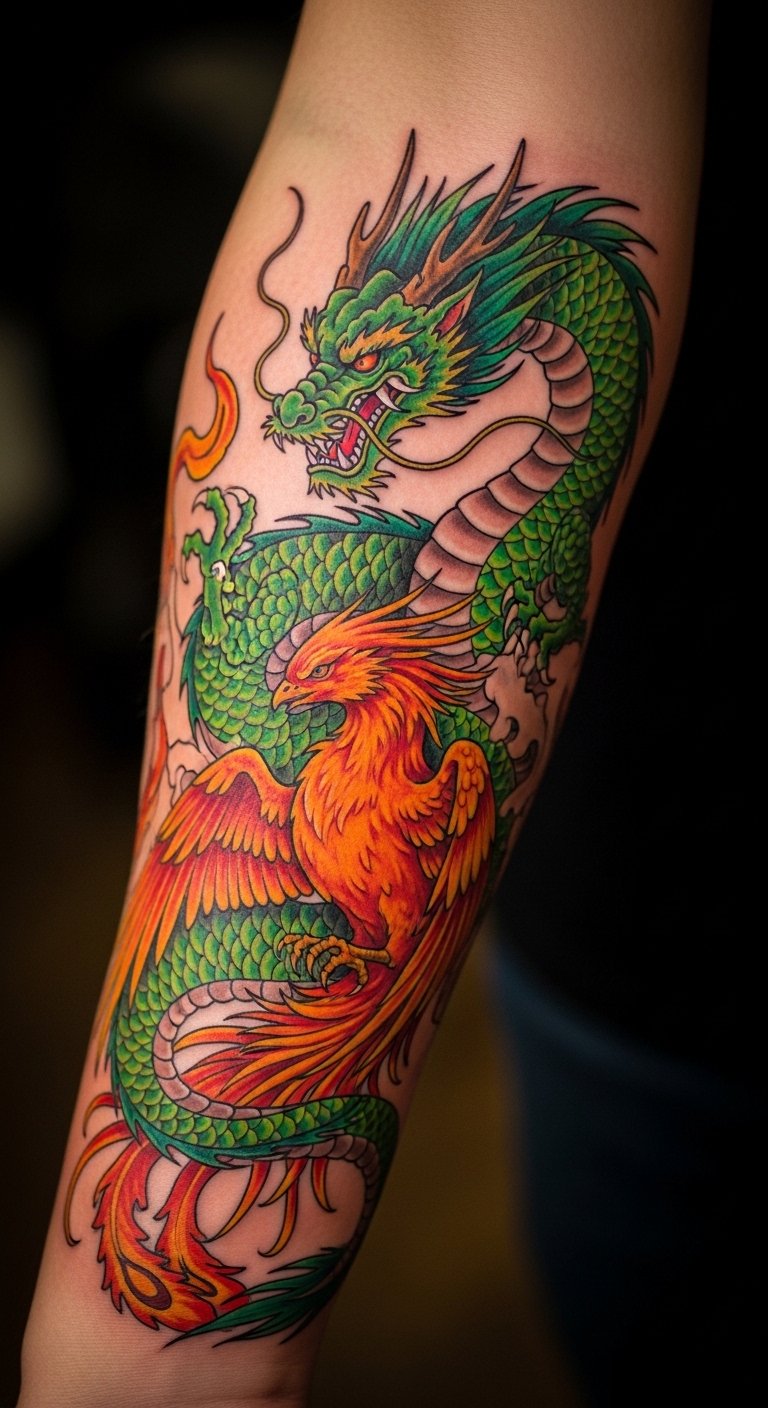 This tattoo embodies the duality of strength and renewal through the dragon and phoenix, representing transformation and the power of overcoming past regrets.
