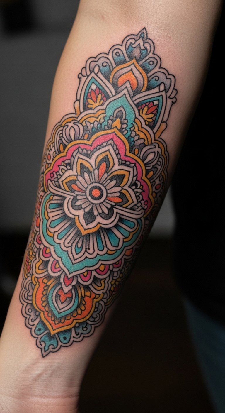 This mandala tattoo embodies a journey of self-discovery and healing, symbolizing balance and harmony in life.