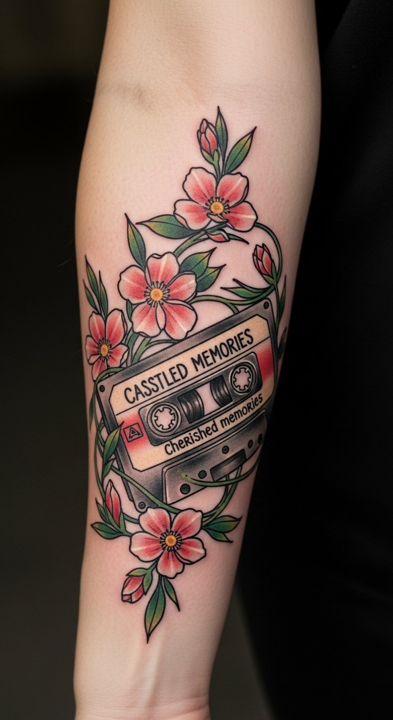 The vibrant colors of the flowers contrast beautifully with the vintage cassette, symbolizing the harmony between old memories and new beginnings, making it a striking piece of personal expression.