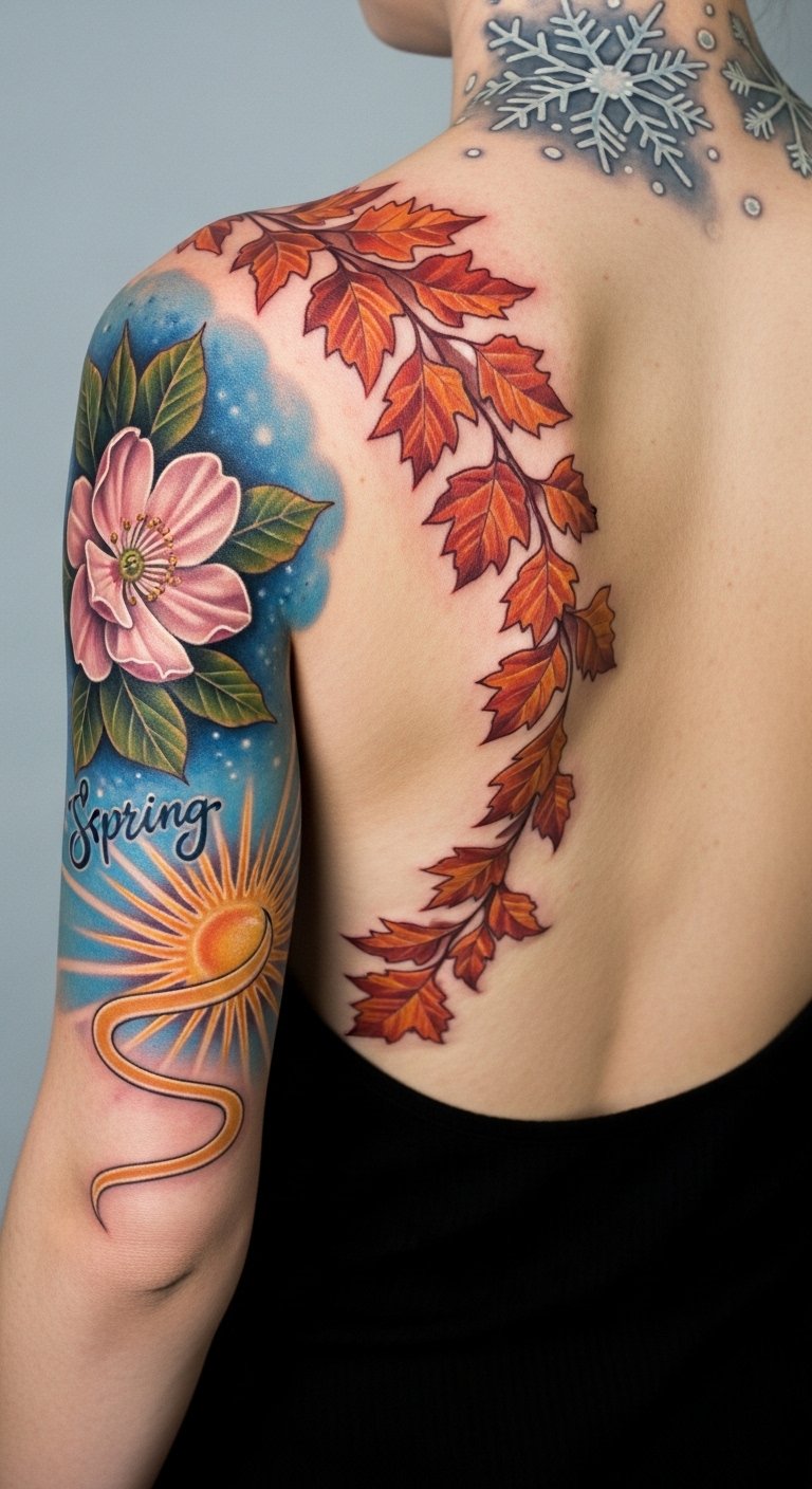 This tattoo concept beautifully captures the essence of the four seasons, each element reflecting the vibrant changes in nature.