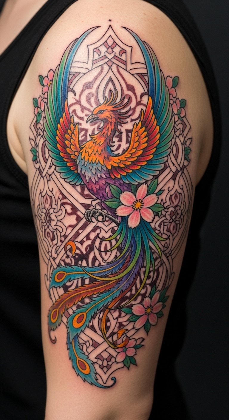 The phoenix represents resilience, while the flowers signify beauty and new beginnings, creating a deeply personal narrative on the skin.