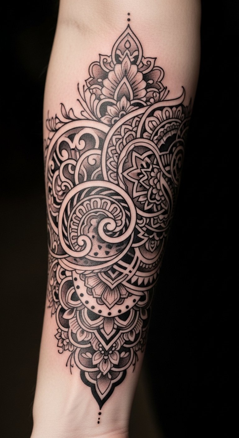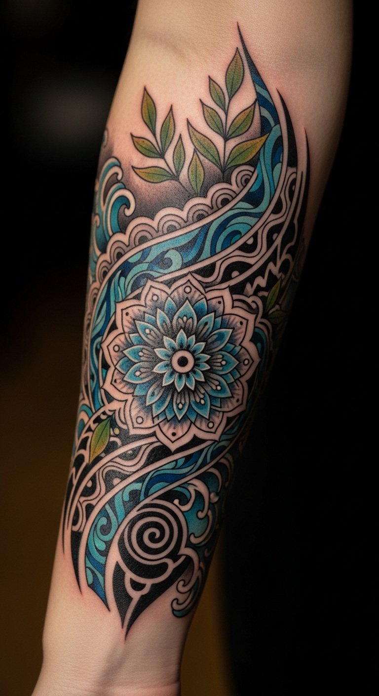 This tattoo design embodies a profound connection to heritage, utilizing elements like the mandala to symbolize harmony and unity.