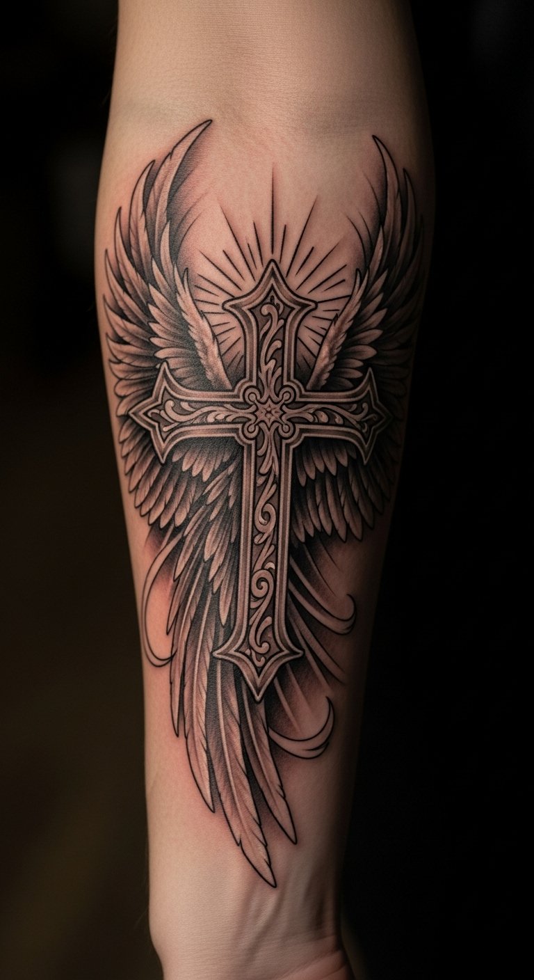 The cross with wings tattoo embodies the dual themes of faith and freedom, making it an inspiring piece of body art. Positioned on the forearm, this location allows for visibility, inviting conversations about its deeper meaning.
