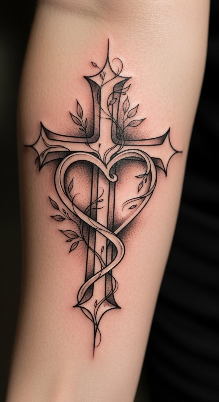 This tattoo symbolizes the harmonious union of faith and love, representing spiritual strength intertwined with emotional depth.