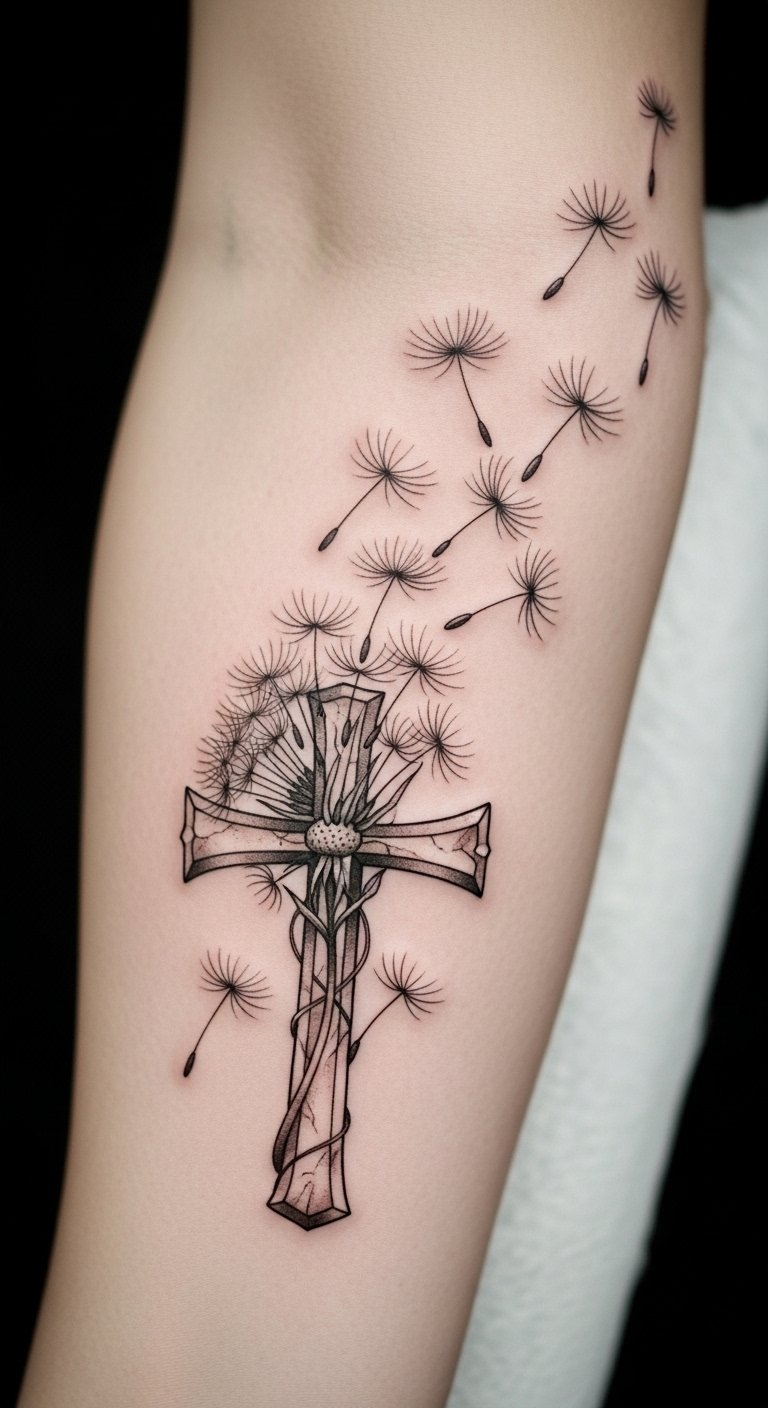 This tattoo symbolizes a profound connection between faith and the fleeting nature of life. The dandelion seeds represent wishes and new beginnings, while the cross signifies spiritual strength.