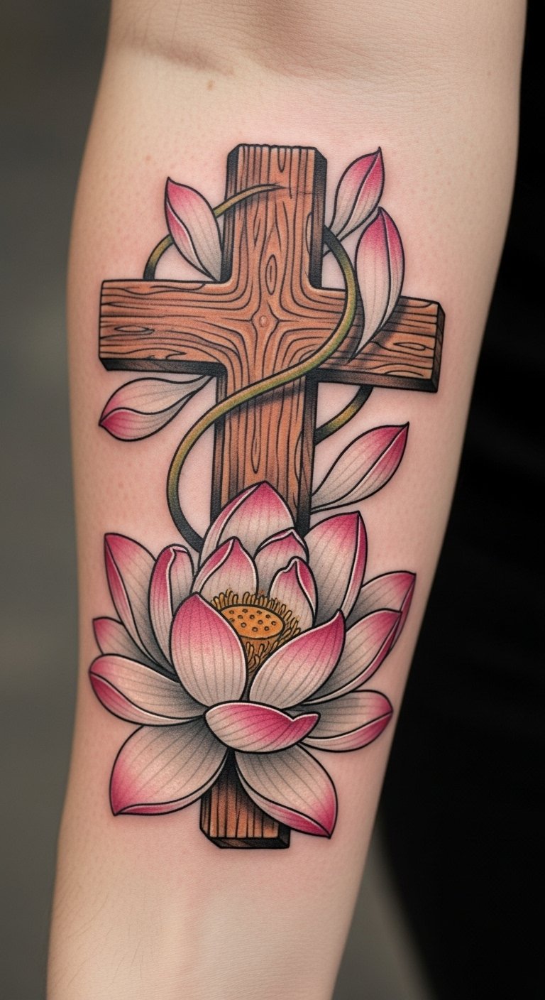Positioned on the forearm, it serves as a constant reminder of faith, protection, purity, and resilience. The cross signifies steadfast belief, while the lotus symbolizes the ability to rise above life’s challenges.