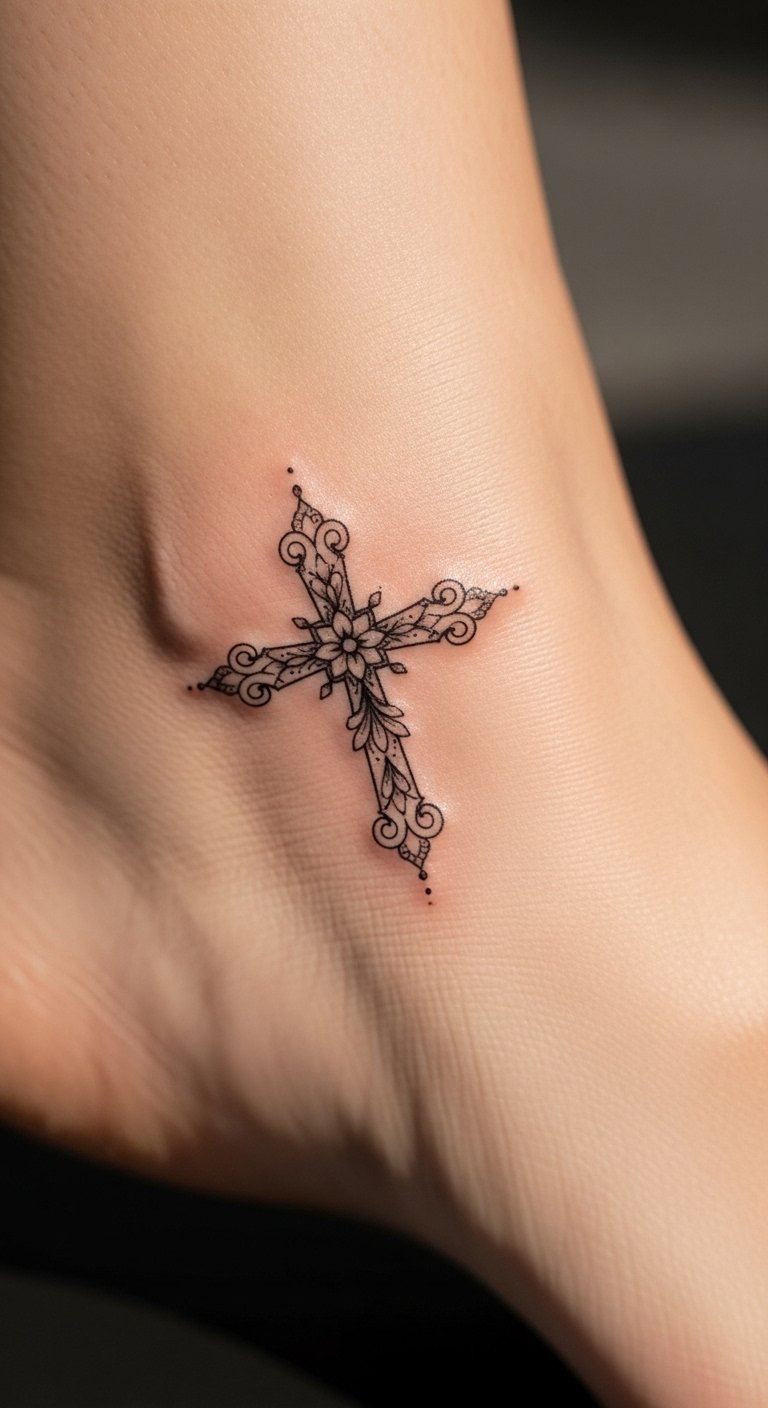 This elegant cross tattoo on the ankle serves as a beautiful symbol of faith and personal style. The intricate design embodies both strength and femininity, while its placement on the ankle allows for a discreet yet impactful expression of spirituality.