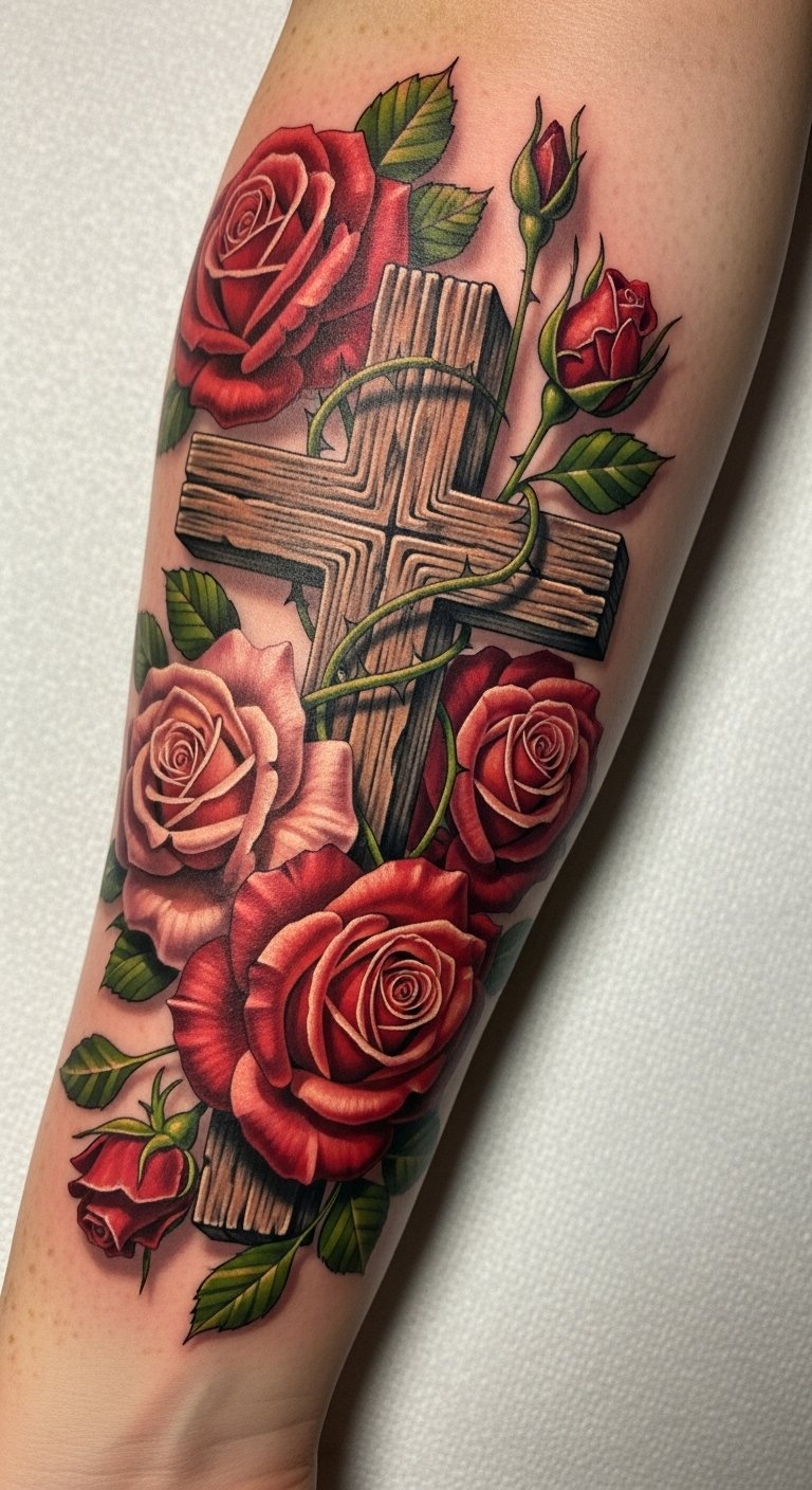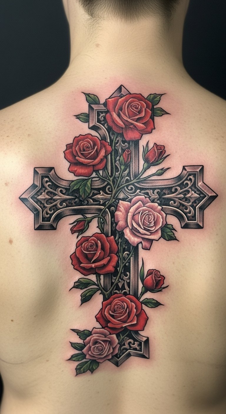 This tattoo design symbolizes the intertwining of faith and nature, where the cross represents belief and hope while the roses signify beauty and resilience.