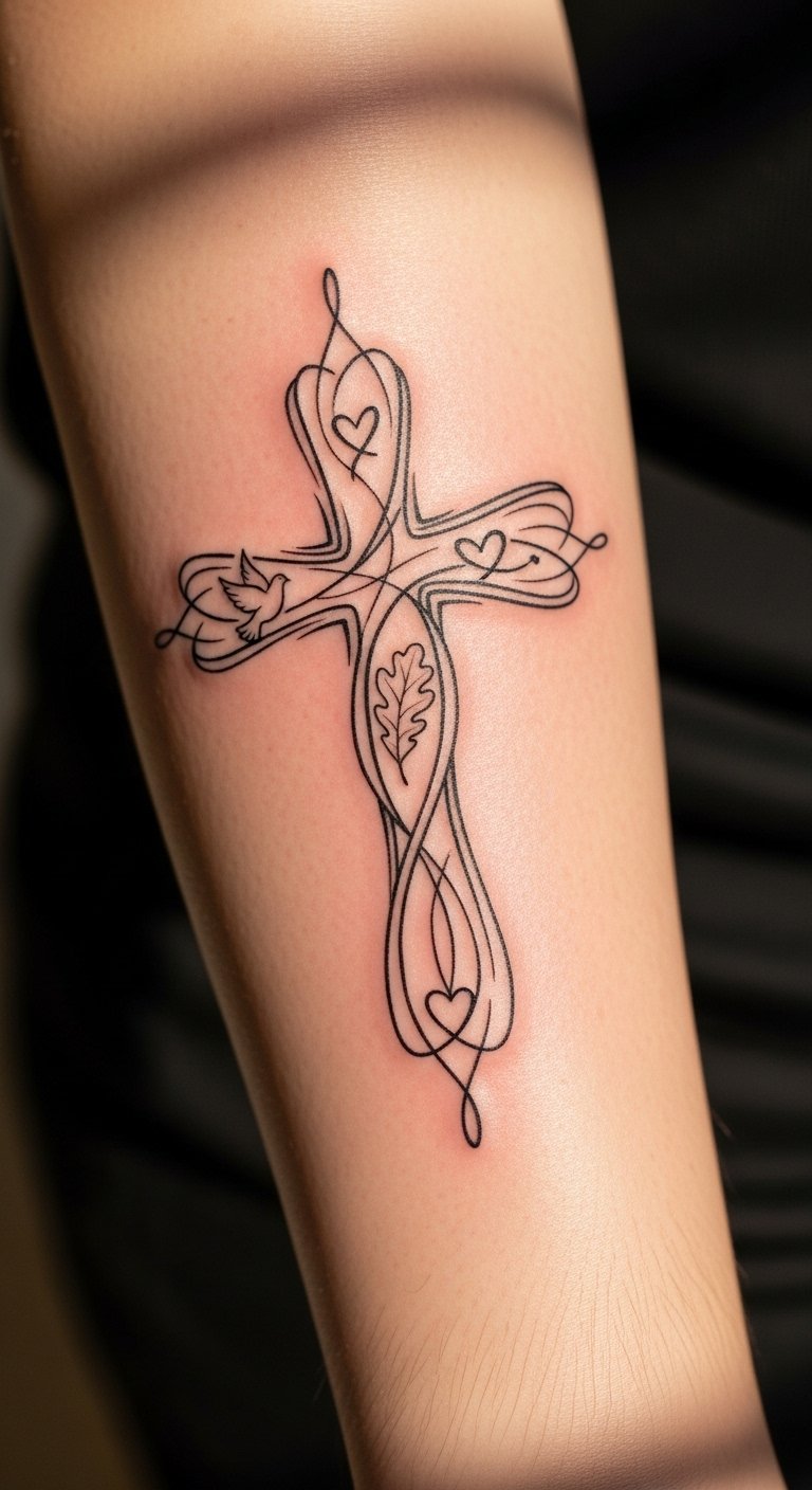 The intricate cross and vine design on the forearm symbolizes a deep connection between spirituality and nature. The vines represent growth, resilience, and a strong bond to the earth, while the cross serves as a powerful emblem of faith and personal journey.