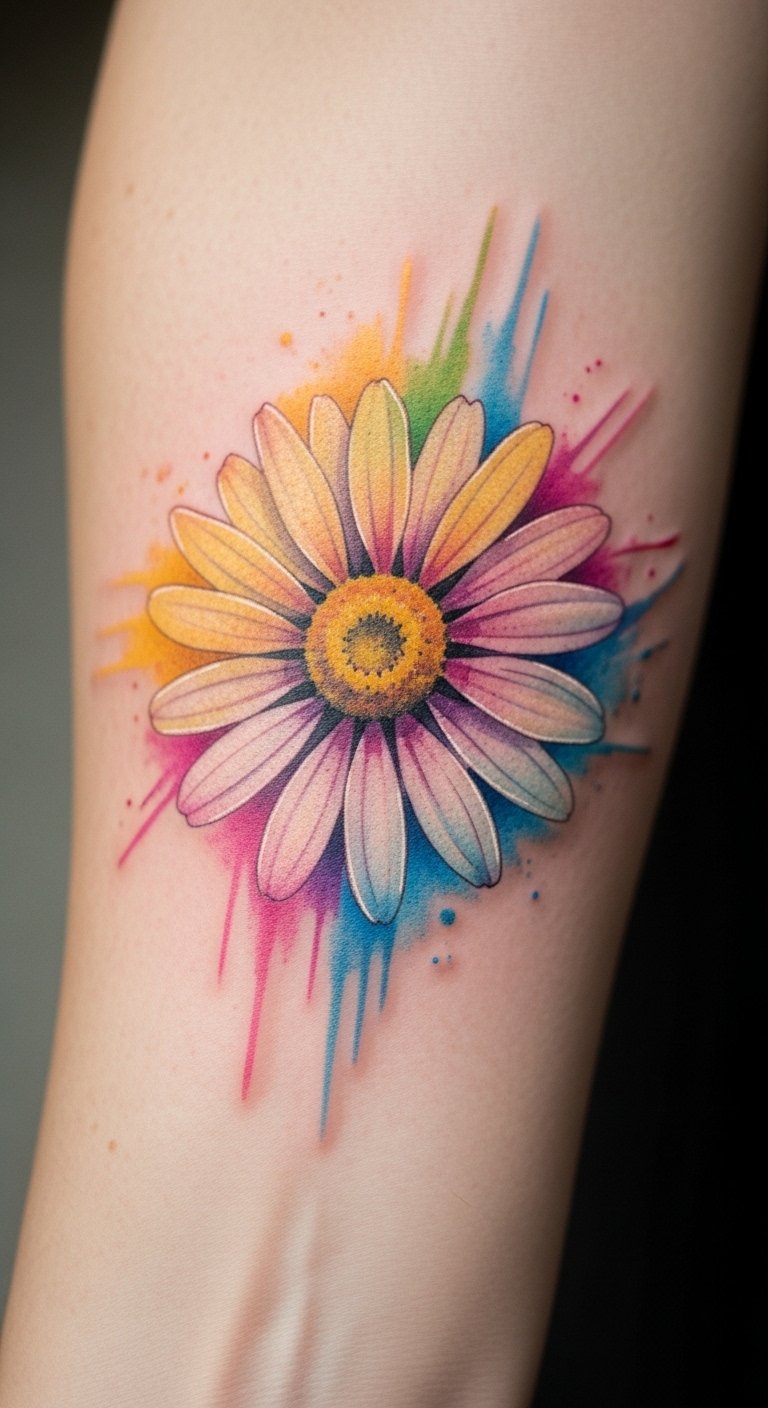 This watercolor daisy tattoo symbolizes joy and new beginnings, embodying a sense of freedom and lightness.