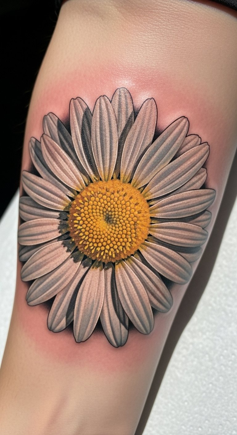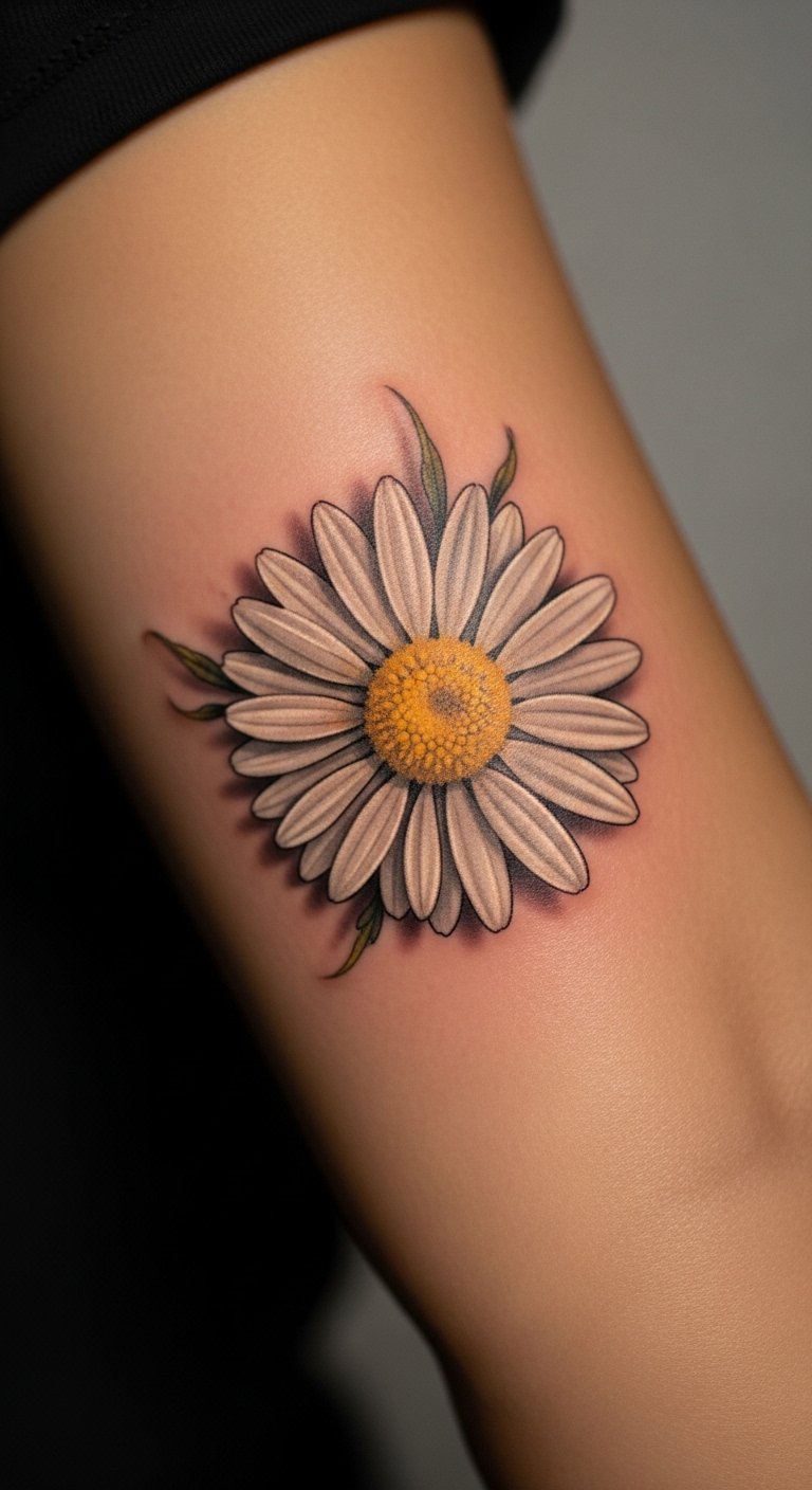 The daisy tattoo symbolizes purity, new beginnings, and resilience, making it a perfect design for those embracing life’s fresh starts.