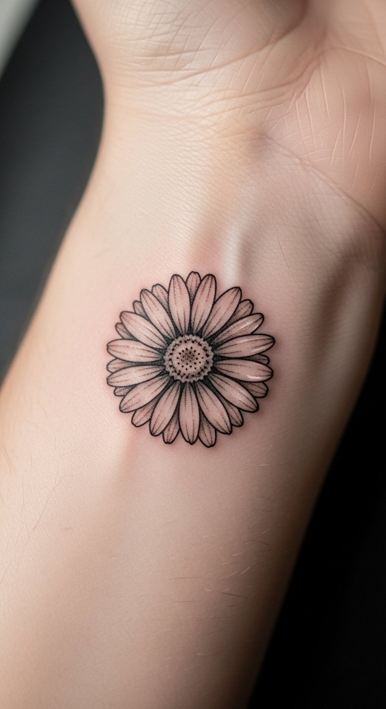 This minimalist daisy tattoo embodies purity and new beginnings, serving as a reminder of growth and renewal.