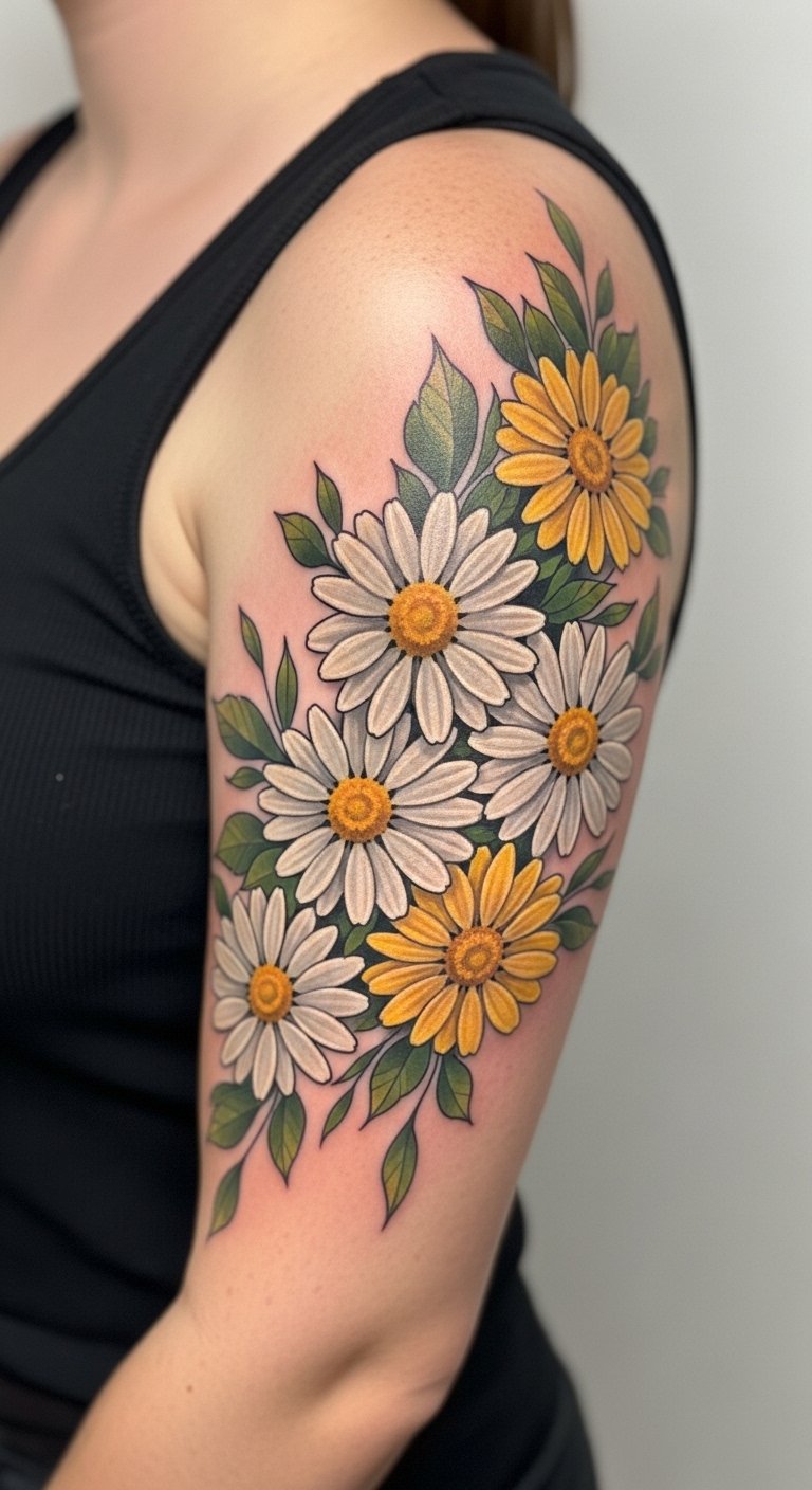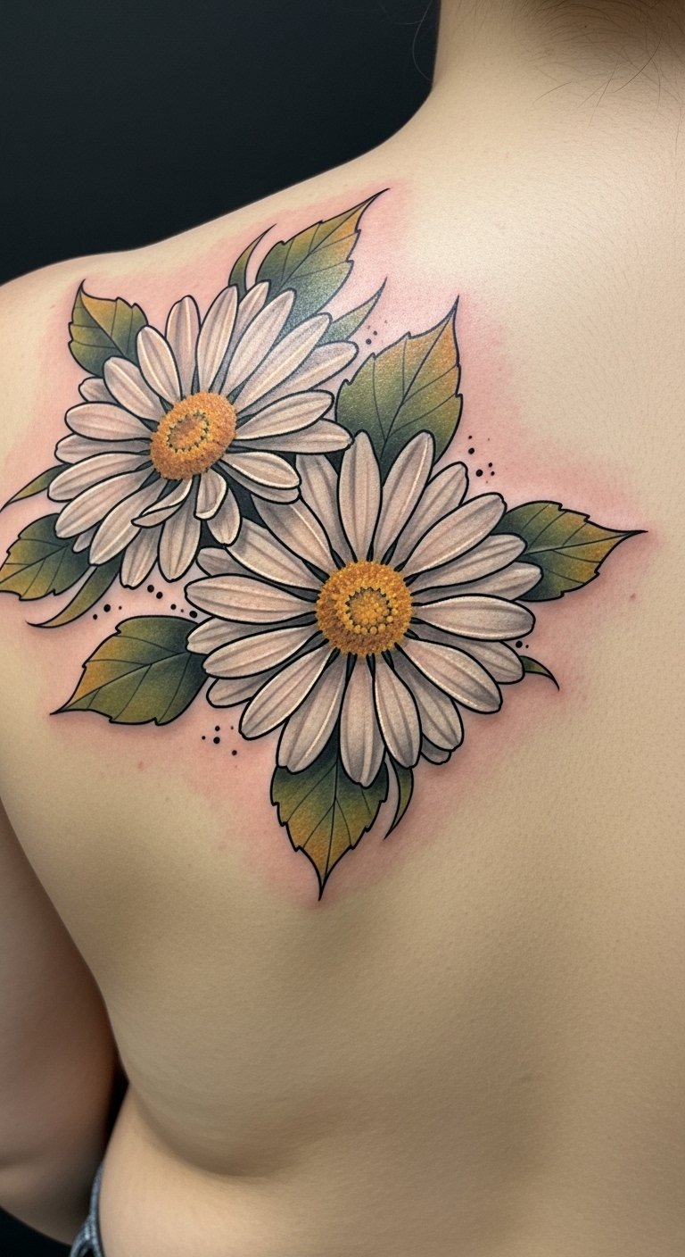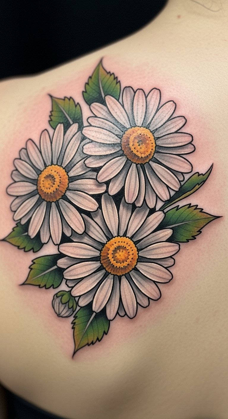 The daisy tattoo on the shoulder blade symbolizes purity, new beginnings, and resilience, making it a perfect representation of one’s journey through life.