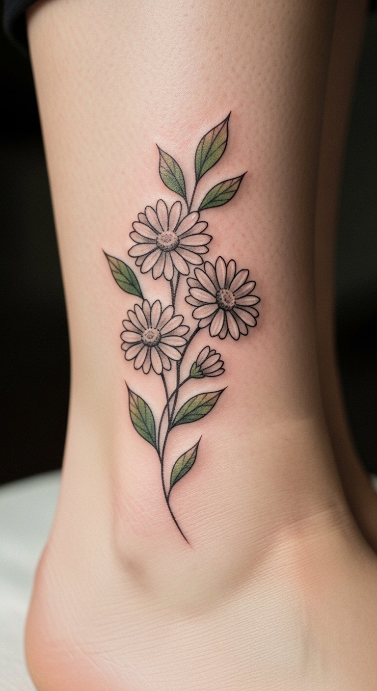 These ankle daisy tattoos serve as a beautiful reminder of purity and new beginnings, harmoniously placed to accentuate the natural curves of the ankle.